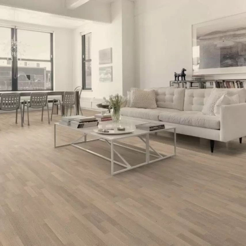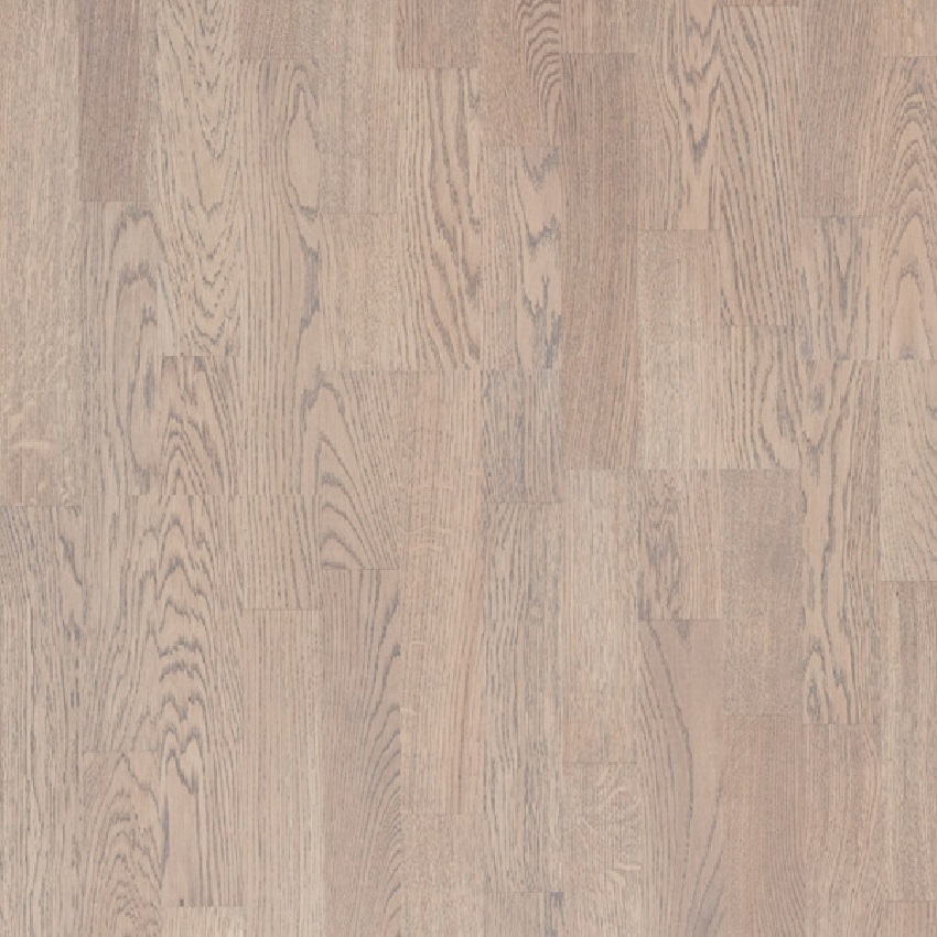 Трехполосный паркет из дуба. Естественные тона натуральной древесины слегка приглушаются под белым матовым лаком. Отлично подойдет для использования в спальнях и детских комнатах.