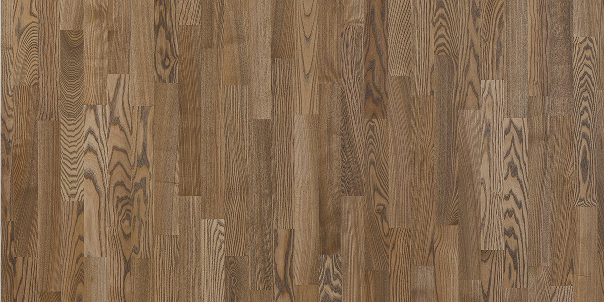 Легко брашированная трехполосная доска из ясеня, покрыта коричневым маслом.