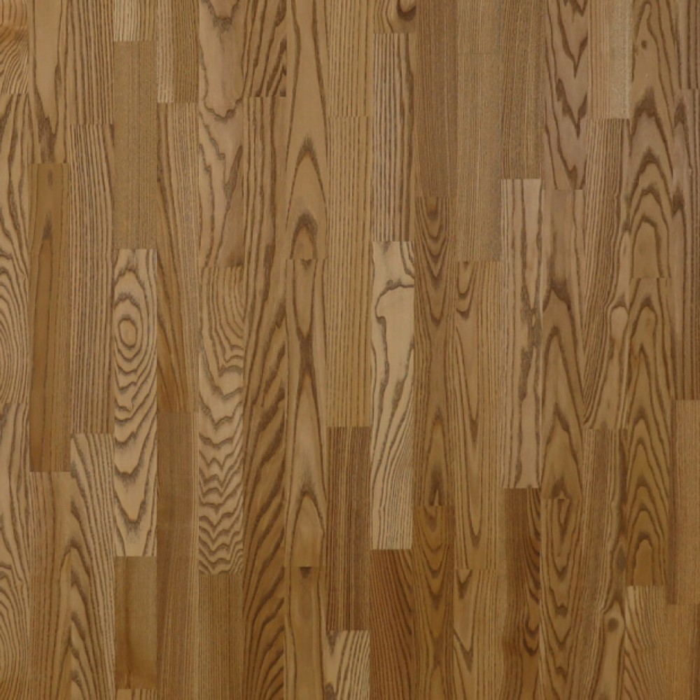 Трехполосный паркет из ясеня. Естественные тона натуральной древесины слегка приглушаются под светло-коричневым маслом. Отлично подойдет для использования в спальнях и детских комнатах.