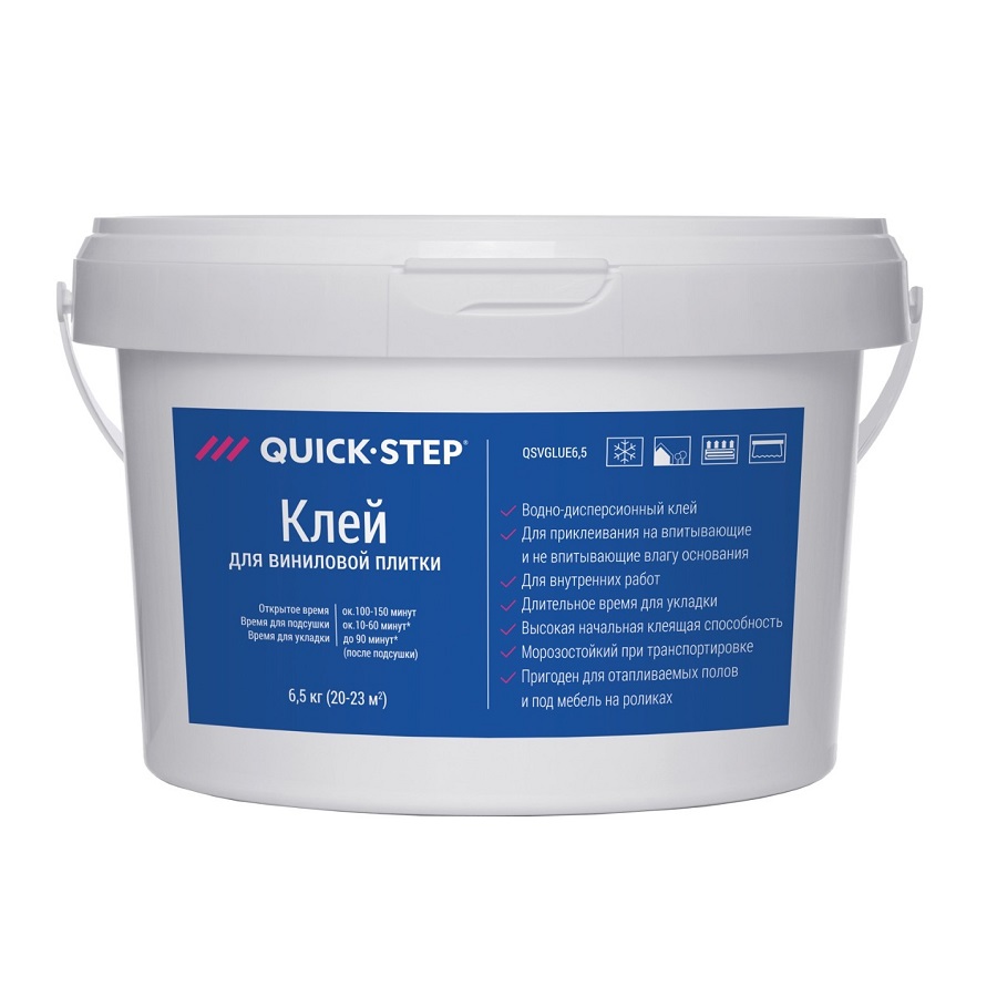 Высокачественный водно-дисперсионный клей Quick-Step Vinyl Glue разработан специально для наших полов виниловых полов. Этот клей пригоден для приклеивания на впитывающее и не впитывающее влагу основание, обладает высокой начальной клеящей способностью, легко наносится и смачивается. Расход 250-350 г/м2, в зависимости от типа чернового пола и впитывающей способности поверхности.