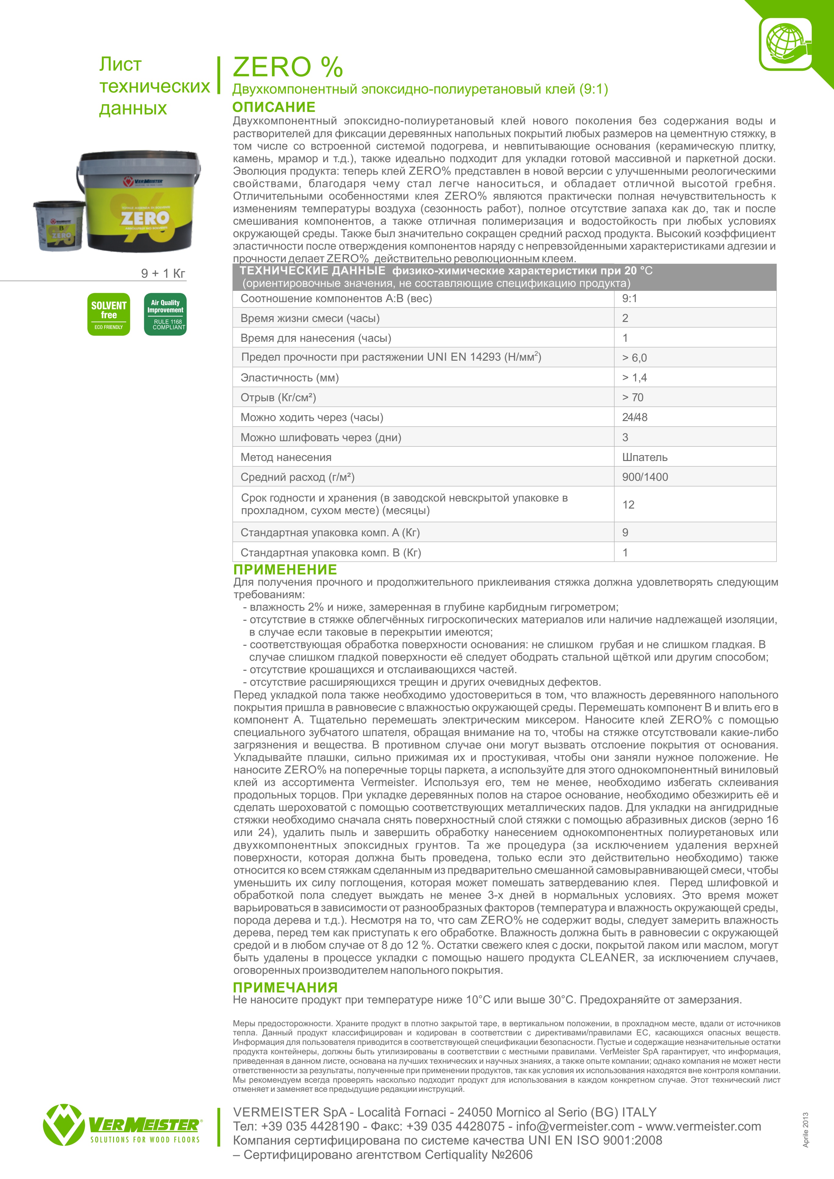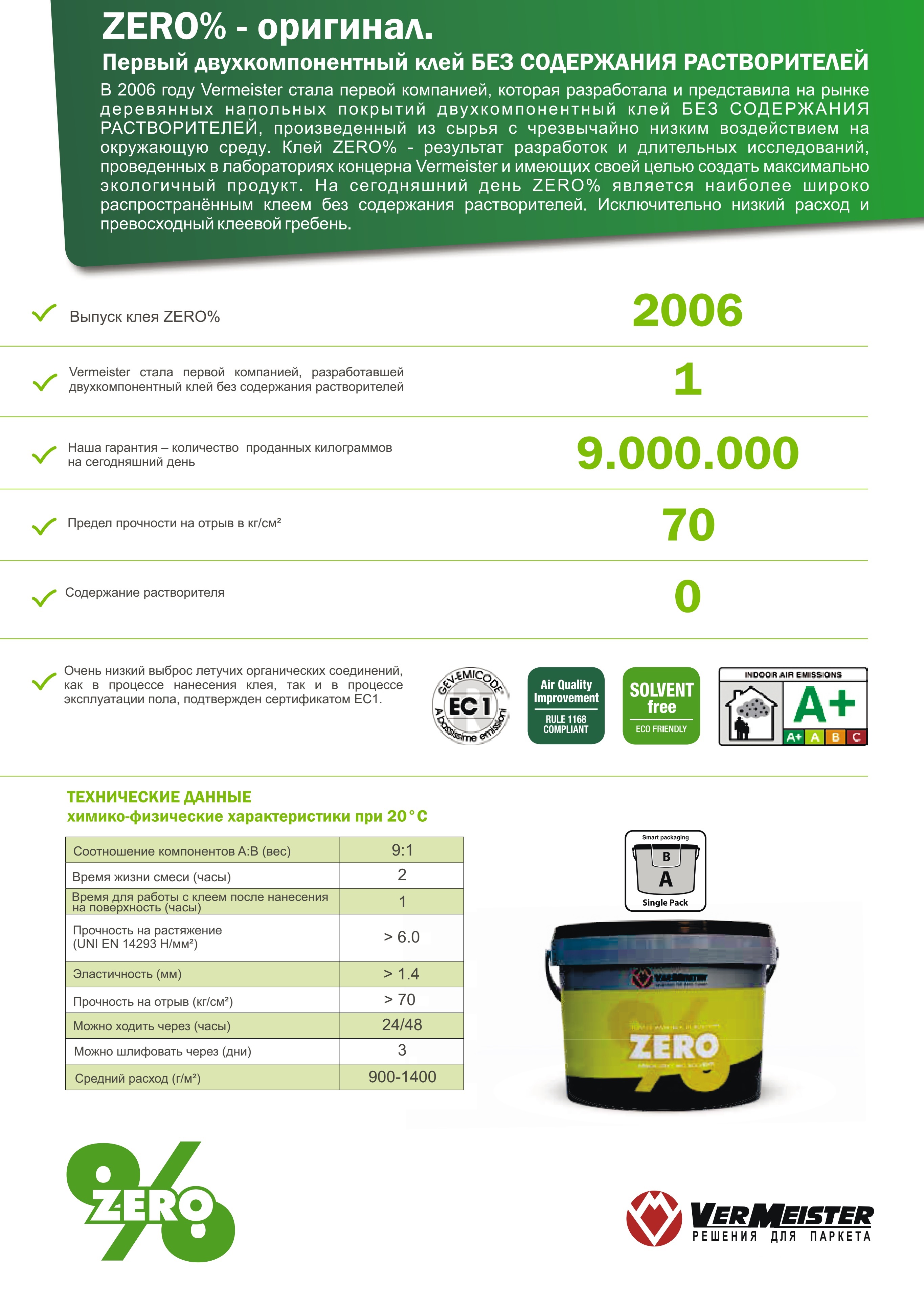 Двухкомпонентный клей ZERO% - отличный выбор, когда перед Вами стоит задача использования строительных и отделочных материалов с повышенными требованиями по экологичности. Данный продукт, относясь к группе эпоксидно-полиуретановых клеев и обладая всеми их преимуществами, при этом не содержит в своем составе какого бы то ни было количества растворителей. Низкий уровень выброса летучих органических соединений, подтвержденный европейским сертификатом EC1, может гарантировать высокий уровень экологической безопасности, как для тех, кто работает с ним при укладке паркета, так и для тех людей, кто будет проживать в этом помещении. Длительные разработки формулы продукта и непрекращающиеся исследования взаимодействия друг с другом его компонентов дали возможность вывести показатели пластической деформации продукта, а также его среднего расхода, прочности и адгезии, на недостижимый до этого уровень. Время жизни смеси продукта составляет не менее двух часов, что позволяет выработать весь объем комплекта клея без нежелательных потерь материала.