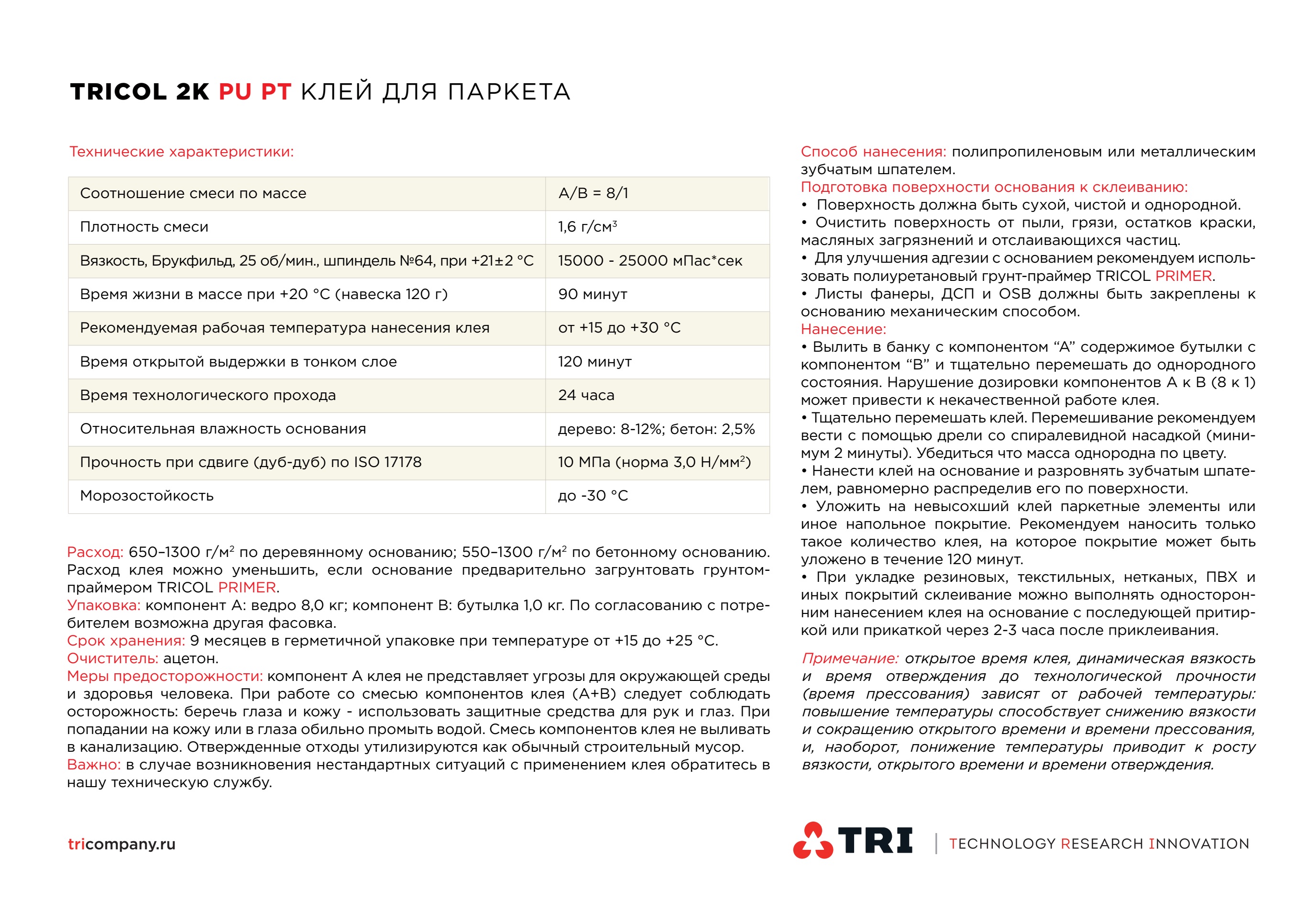 Клей применяется для приклеивания различных видов паркета, в том числе штучного и мозаичного из экзотических пород древесины (мербау, кемпас, тик, ипе, бамбук и другие), а также, любых напольных покрытий на основе дерева, рулонных резиновых покрытий, искусственной травы, ПВХ и резиновой плитки, любого линолеума, текстильных покрытий, нетканых материалов на бетонные и любые деревянные основания (фанера, ДВП, ДСП, OSB).