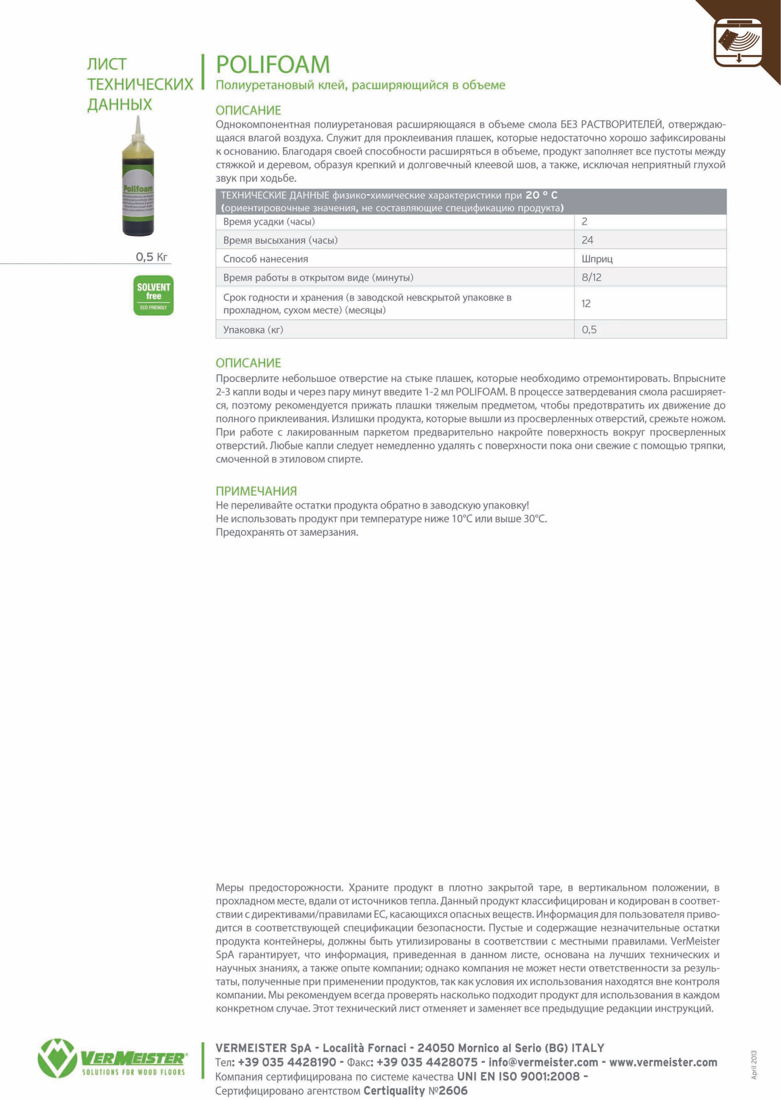 Полиуретановая смола для ремонта скрипящего паркета. Практически не имеющий аналогов на рынке состав, с помощью которого в считанные минуты можно избавиться от раздражающего годами скрипа деревянных плашек. Всего лишь несколько капель данного клея в просверленное на стыке паркетных планок отверстие, и попав в пространство под него, смола начинает расширяться в объеме до тех пор, пока не заполнит всю пустоту. Затем благодаря реакции с влагой, содержащейся в воздухе, POLIFOAM полимеризуется, образуя прочнейший клеевой шов, который на долгие годы зафиксирует отходящий от основы, болтающийся паркет. Больше не нужно тратиться на полный демонтаж старого, но в целом качественного напольного покрытия. Продукт не содержит в своем составе растворителей, легок в применении и гарантирует качественный локальный ремонт, который под силу выполнить даже непрофессионалу. Сфера применения клея широка: может применяться во всех случаях, когда требуется крепкая фиксация, в том числе не впитывающих поверхностей. В подавляющем большинстве случаев в условиях домашнего паркета достаточно всего одного тюбика клея, чтобы избавиться от надоевшего скрипа и глухого стука при ходьбе.