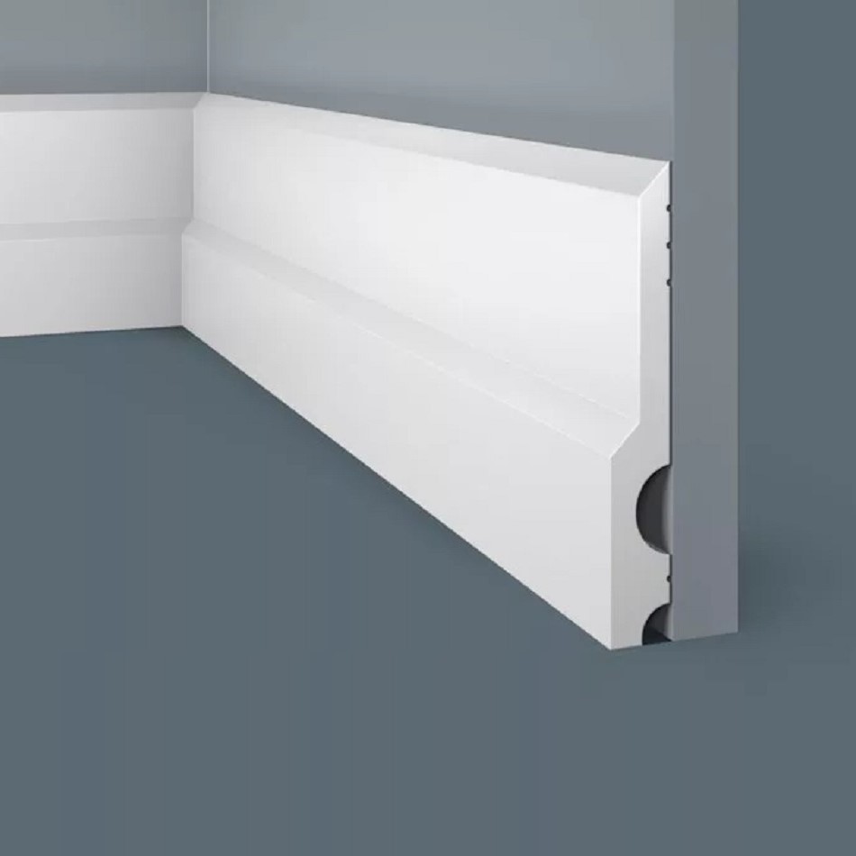 Плинтус Cosca Decor изготовлен из ударопрочного экополимера (композит с добавлением светостабилизатора). Плинтус уже загрунтован, благодаря чему его можно не окрашивать - он сохранит белый цвет и не пожелтеет со временем. Покрасить его также очень легко с помощью любой водоэмульсионной краски.