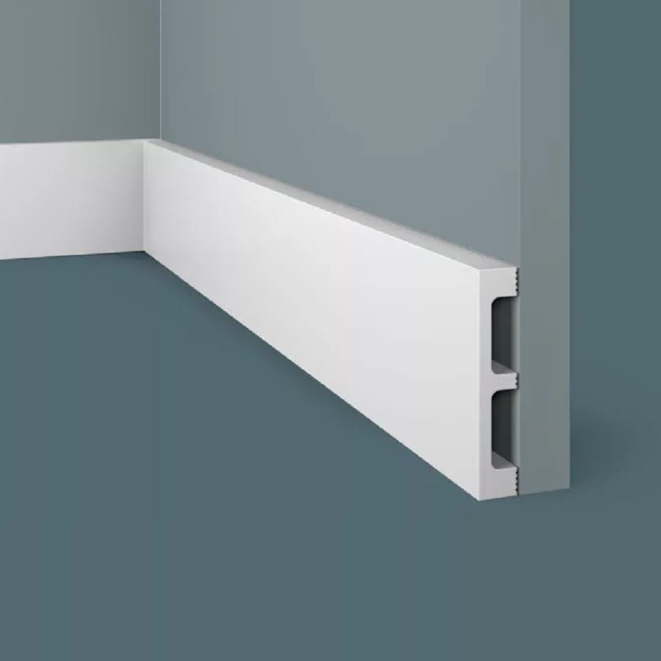 Плинтус Cosca Decor изготовлен из ударопрочного экополимера (композит с добавлением светостабилизатора). Плинтус уже загрунтован, благодаря чему его можно не окрашивать - он сохранит белый цвет и не пожелтеет со временем. Покрасить его также очень легко с помощью любой водоэмульсионной краски.