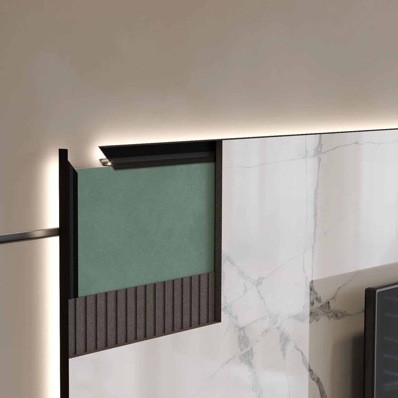 Для установки рейки MULTILEVEL с керамогранитом, достаточно приклеить (зафиксировать) лист гипсокартона 12,5мм и, далее – зафиксировать керамогранит, при помощи клея. Если финишное покрытие зеркало, стекло, или стеновая панель, толщиной 4 мм, достаточно – взять 2 листа гипсокартона, толщиной 9,5 мм и финишное покрытие не более 4мм.