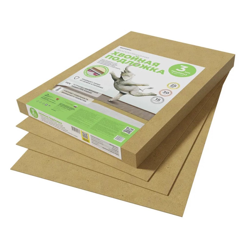 Подложка из древесного волокна (подложка из мдвп) используется в качестве тепловой и акустической (до 25 Дб) изоляции, а также выравнивающей подложки под финишными напольными покрытиями: ламинированными полами, паркетом, линолеумом, полами LVT и др. (компенсирует неровности поверхности до 3 мм).